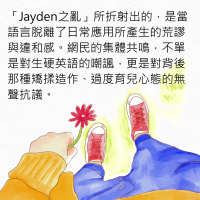 近日,香港網絡掀起了一股「Jayden之亂」。起因是兩位 KOL 在社交平台上載了一系列模仿「現代典型港媽」的短片,傳神地演繹了港媽教導子女時的語氣。片中刻意在句子中加入極不流暢且生硬的英文單字,例如:「Jayden,Mami told you 呀,食唔晒唔好攞咁多,too much 啦,wasted 呀。」隨即引發網民熱烈討論。
