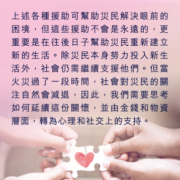 上述各種援助可幫助災民解決眼前的困境,但這些援助不會是永遠的,更重要是在往後日子幫助災民重新建立新的生活。除災民本身努力投入新生活外,社會仍需繼續支援他們。但當火災過了一段時間,社會對災民的關注自然會減退,因此,我們需要思考如何延續這份關懷,並由金錢和物資層面,轉為心理和社交上的支持。政府和社福機構需設立長期跟進的機制,例如定期探訪、心理輔導計劃或重建社區網絡,讓災民不只渡過眼前難關,還能重建安定的生活。作為社區的一分子,每個人也能從小事做起,將是次災難的傷痛銘記在心,明白災民們面對的難處,可參與義工活動,或只是簡單的一句問候,已能為災民送上溫暖。