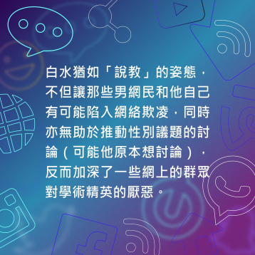 因此,在這些背景底下,白水猶如「說教」的姿態,不但讓那些男網民和他自己有可能陷入網絡欺凌,同時亦無助於推動性別議題的討論(可能他原本想討論),反而加深了一些網上的群眾對學術精英的厭惡。