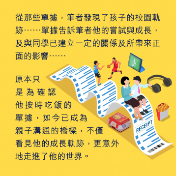 某天,收據上出現「鰻魚飯」的字樣,令筆者感到突然,因為兒子比較抗拒不常見的食物,在人生中他從未吃過鰻魚,他竟然與同學一起吃人生第一頓鰻魚飯。問起緣由,他說:「同學都點了,我也想試試看。」那一刻,單據告訴筆者他的嘗試與成長,及與同學已建立一定的關係及所帶來正面的影響,之後我們還繼續談論鰻魚的味道。
