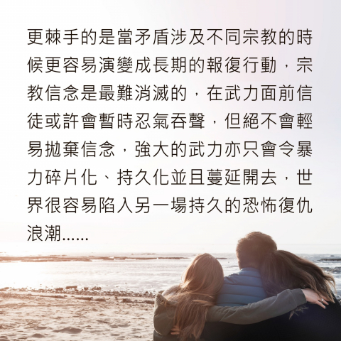 有人覺得不少基督徒想信以愛與和平去改變世界有點天真、甚至迂腐,但以為以暴易暴、以眼還眼可以快速及長遠地解決難題何嘗不是太天真、太狂妄?面對世界上種種戰爭和暴力,特別是所謂對惡人先下手為強,很容易成為有權有勢的當權者欺侮他人的藉口,國際秩序其中一個重要的原則是相互尊重,有規有矩,不是權力大的說了算,否則雖然消滅或削弱了一個專權的政府,卻只會造就另一個專權政府的出現。更棘手的是當矛盾涉及不同宗教的時候更容易演變成長期的報復行動,宗教信念是最難消滅的,在武力面前信徒或許會暫時忍氣吞聲,但絕不會輕易拋棄信念,強大的武力亦只會令暴力碎片化、持久化並且蔓延開去,世界很容易陷入另一場持久的恐怖復仇浪潮,耀武揚威的得益者恐怕只會是看重個人短暫利益的當權者,其他人只能為此而擔驚受怕、付出代價。