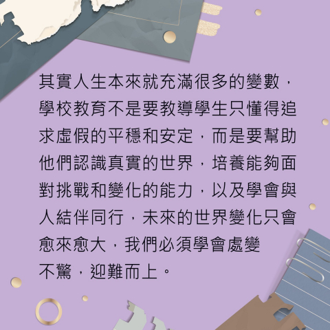 除了教師之外,不同行業的僱員都要面對一個急劇改變的社會大環境,必須有心理準備學習改變,因為很多工種未來都有被AI取代的可能,而且出生人口減少、移出移入的人口改變,經濟和政治環境的轉變,甚至忽然發生的天災或戰爭,都會突然打垮我們的種種計劃,人生本來就要有心理準備去面對種種不可知的未來。傳道書九章12節提醒我們:「原來人也不知道自己的定期。魚被惡網圈住,鳥被網羅捉住,禍患忽然臨到的時候,世人陷在其中也是如此。」聖經不是教我們做一個杞人憂天的人,而是要做個常常作最好的準備、最壞的打算的人,人很多的困擾是因為我們預設了一些我們自以為是最好、最合理、最應該出現的結果,當事與願違便會陷入極大的困苦之中,誰不知這只是我們自己一廂情願的看法,甚至以為上帝也應該與我們有同一水平的智慧。其實人生本來就充滿很多的變數,學校教育不是要教導學生只懂得追求虛假的平穩和安定,而是要幫助他們認識真實的世界,培養能夠面對挑戰和變化的能力,以及學會與人結伴同行,未來的世界變化只會愈來愈大,我們必須學會處變不驚,迎難而上。