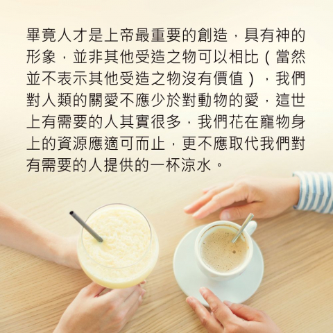 另一方面,當看到一些寵物主人毫不吝嗇地為寵物購置衣物、像佈置嬰兒房一樣佈置寵物的愛巢,面不改容地購買價錢不菲的寵物月餅、寵物生日蛋糕、以及用嬰兒手推車來推寵物外出,心中總有點戚戚然,其實我們是在滿足自己還是真的是為了滿足寵物的需要?因為對貓狗來說最重要是好味和有營養,甚麼月餅不月餅對牠們來說是多此一舉,而狗狗最喜歡的是四處走,卻被人當作無法行走的嬰兒困在手推車上,究竟是主人還是寵物想逛商場呢?若果主人是以此來彌補自己童年的缺乏,或者沒有兒女的遺憾,實在有點浪費,若能將一些非必要的開支用在幫助其他有需要的人豈不更是美事?畢竟人才是上帝最重要的創造,具有神的形象,並非其他受造之物可以相比(當然並不表示其他受造之物沒有價值),我們對人類的關愛不應少於對動物的愛,這世上有需要的人其實很多,我們花在寵物身上的資源應適可而止,更不應取代我們對有需要的人提供的一杯涼水。