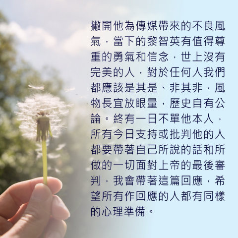 撇開他為傳媒帶來的不良風氣,當下的黎智英有值得尊重的勇氣和信念,世上沒有完美的人,對於任何人我們都應該是其是、非其非,風物長宜放眼量,歷史自有公論。終有一日不單他本人,所有今日支持或批判他的人都要帶著自己所說的話和所做的一切面對上帝的最後審判,我會帶著這篇回應,希望所有作回應的人都有同樣的心理準備。