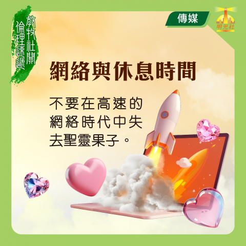 因著網絡發展,人們的休息時間及溝通質素亦有所影響,我們要學習節制、平衡使用網絡及休息。在高速的網絡時代,當人溝通的時候,亦需要學習保持仁愛、溫柔、良善、信實,這實在要有耐性,以及從神而來的智慧,不要讓網絡奪去我們的聖靈果子。