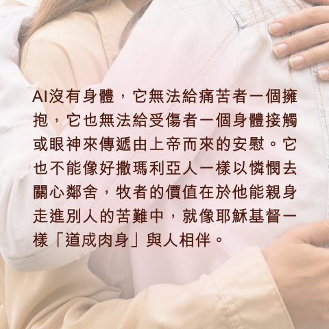 AI確實可以就用戶提出的問題提供及整理所有經文、禱文及建議,但它卻無法「與哀哭的人同哭」。在路加福音10章27至28節中,經文提到律法師想試探耶穌,律法師雖然對聖經背得滾瓜爛熟,能即時背出律法上如何可以承受永生。然而,耶穌回答說:你回答的是。他們的回答確實正確,但耶穌繼續說:「你這樣行,就必得永生。」原來得到永生的方法並不是你的頭腦對聖經的認識有多少,而是我們是否能夠行出信仰。AI沒有身體,它無法給痛苦者一個擁抱,它也無法給受傷者一個身體接觸或眼神來傳遞由上帝而來的安慰。它也不能像好撒瑪利亞人一樣以憐憫去關心鄰舍,牧者的價值在於他能親身走進別人的苦難中,就像耶穌基督一樣「道成肉身」與人相伴。AI只能收集知識再輸出,它是無法實現真正的牧養。再者,牧者所領受的是由聖靈而來的啟示,也是AI不能領受的,AI儘管可以接受任何的訓練,但只有真正的牧者才能領受上帝的臨在,與教友同行,與他們一起走在上帝的愛中。
