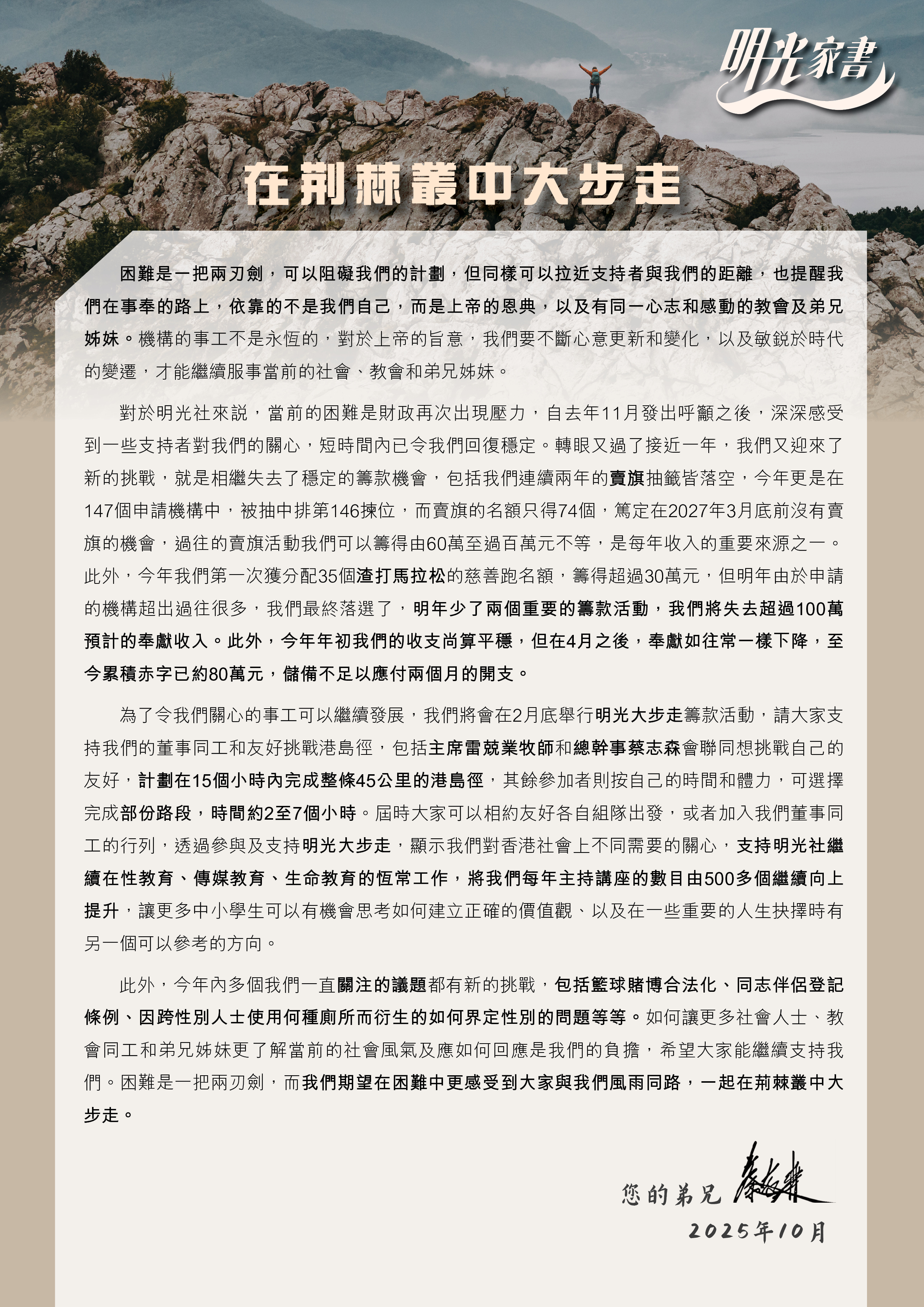 對於明光社來說,當前的困難是財政再次出現壓力,自去年11月發出呼籲之後,深深感受到一些支持者對我們的關心,短時間內已令我們回復穩定。轉眼又過了接近一年,我們又迎來了新的挑戰,就是相繼失去了穩定的籌款機會,包括我們連續兩年的賣旗抽籤皆落空,今年更是在147個申請機構中,被抽中排第146揀位,而賣旗的名額只得74個,篤定在2027年3月底前沒有賣旗的機會,過往的賣旗活動我們可以籌得由60萬至過百萬元不等,是每年收入的重要來源之一。此外,今年我們第一次獲分配35個渣打馬拉松的慈善跑名額,籌得超過30萬元,但明年由於申請的機構超出過往很多,我們最終落選了,明年少了兩個重要的籌款活動,我們將失去超過100萬預計的奉獻收入。此外,今年年初我們的收支尚算平穩,但在4月之後,奉獻如往常一樣下降,至今累積赤字已約80萬元,儲備不足以應付兩個月的開支。