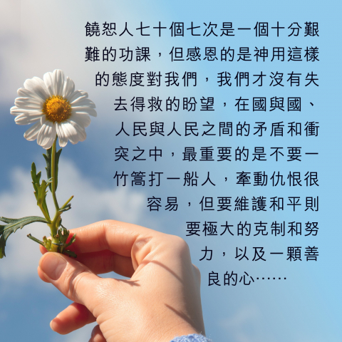 饒恕人七十個七次是一個十分艱難的功課,但感恩的是神用這樣的態度對我們,我們才沒有失去得救的盼望,在國與國、人民與人民之間的矛盾和衝突之中,最重要的是不要一竹篙打一船人,牽動仇恨很容易,但要維護和平則要極大的克制和努力,以及一顆善良的心,但願大家都能珍惜得來不易的和平。